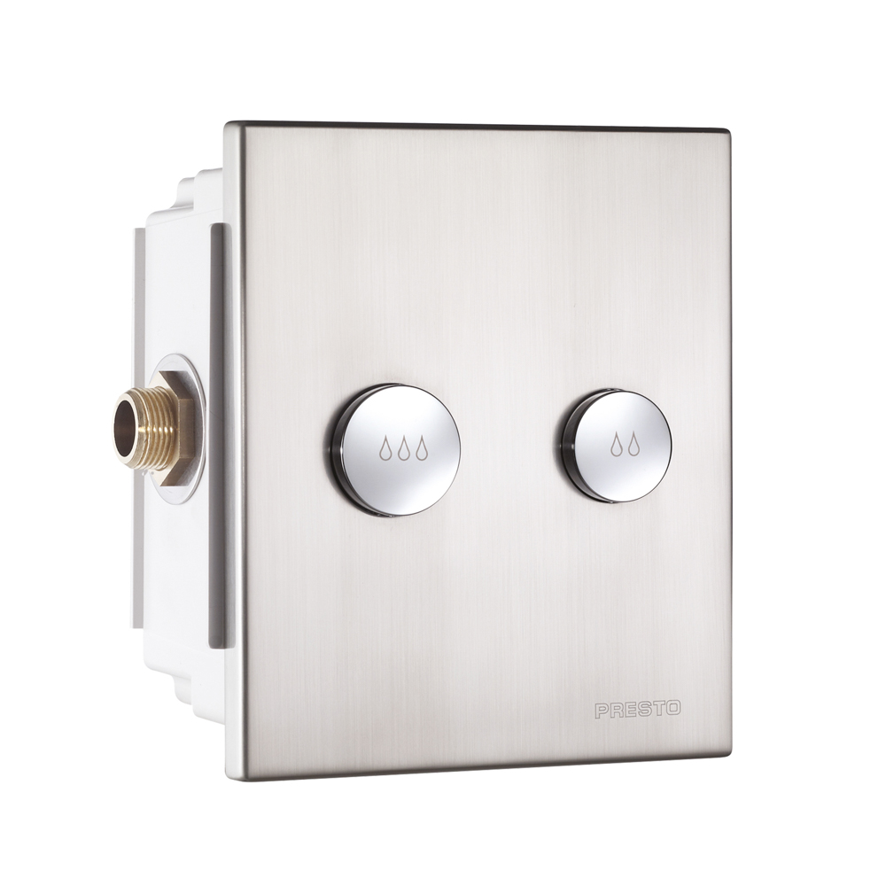 Fluxor temporizado para encastrar en muro con cuerpo de latón, dispositivo antisifónico incorporado y pulsación antiblocaje.