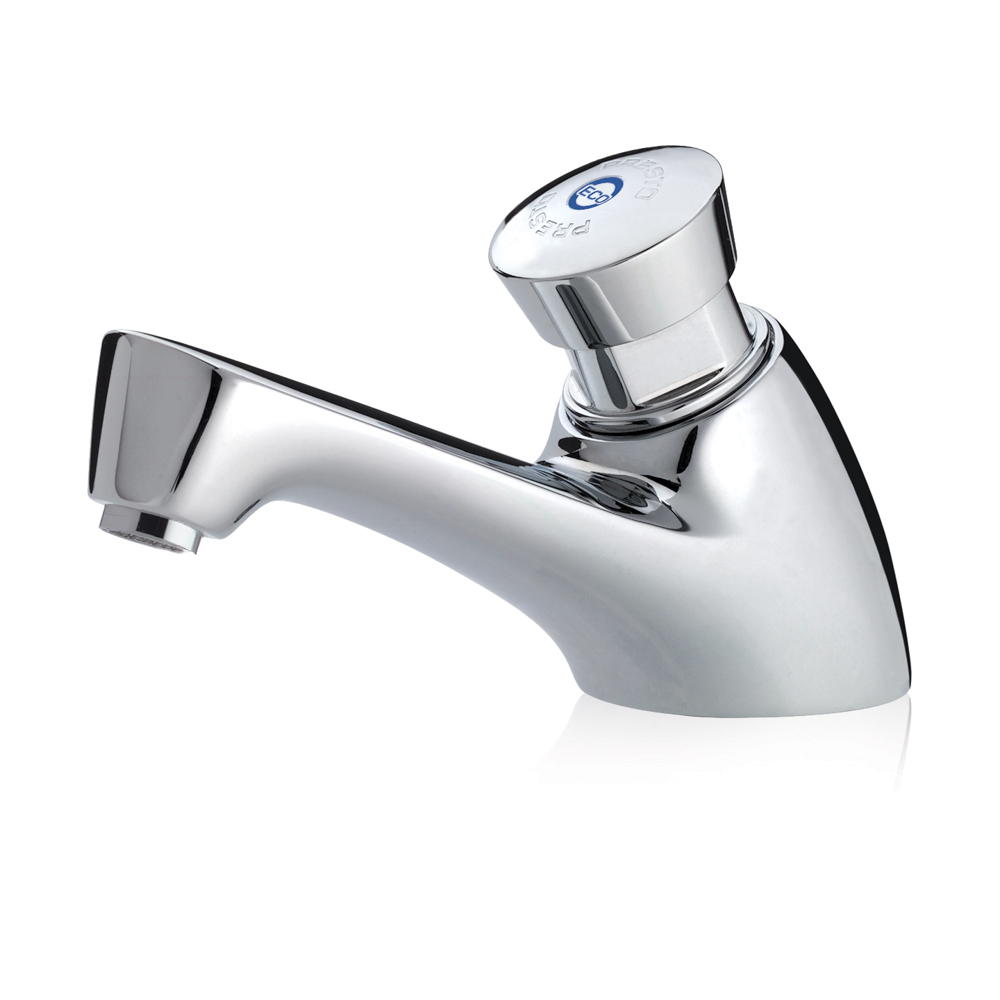 Apertura por pulsador. Cuerpo y pulsador en latón cromado, piezas interiores en materiales resistentes a la corrosión y a las incrustaciones calcáreas. *Cabeza intercambiable que comprende todo el mecanismo del grifo. *Peso bruto: 0,730 Kg. *Consumo: 0,33 l por cada uso.