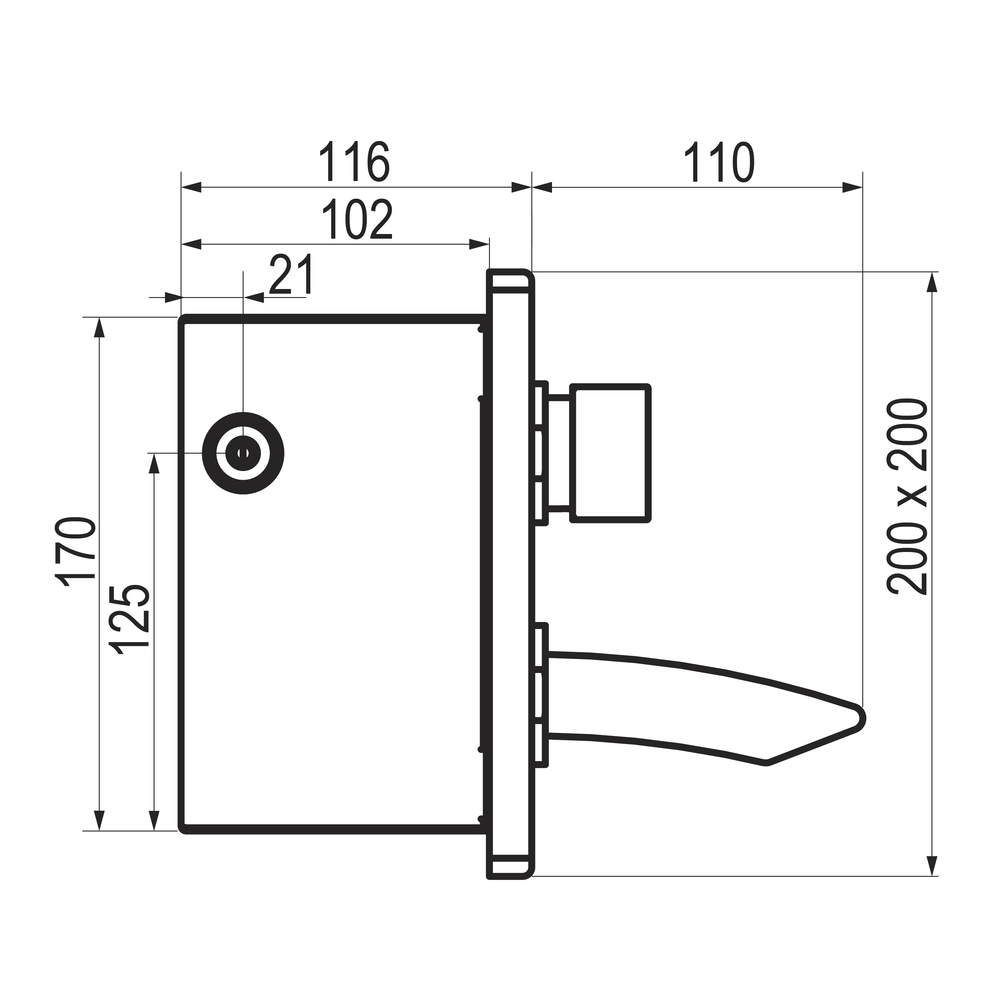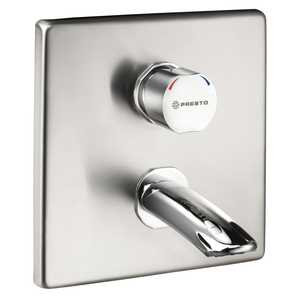 Salida con caño curvo incorporado de longitud 107 mm. *Apertura por pulsador con sistema antiblocaje que impide la salida continua del agua mediante el cierre instantáneo en caso de bloqueo voluntario del pulsador. *Cabeza intercambiable que comprende todo el mecanismo del grifo. *Cuerpo y pulsador en latón cromado, piezas interiores en materiales resistentes a la corrosión y a las incrustaciones calcáreas. *Selección de temperatura en la Cabeza. *Tapa en acero inoxidable de 200 x 200 mm. *Caja de empotrar y placa de fijación intermedia fabricadas con protección antioxidante. *Cabezal intercambiable con Presto Arte AM. *Peso bruto: 3,310 kg.