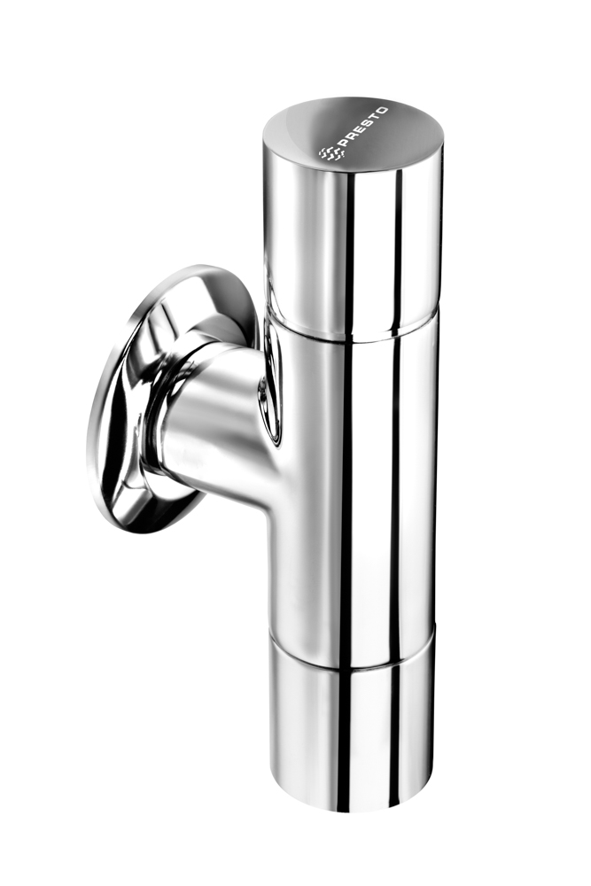 Fluxor temporizado ecológico de fijación sobre muro con cuerpo y embellecedor en latón cromado. Dispositivo antisifónico incorporado. Pistón intercambiable.