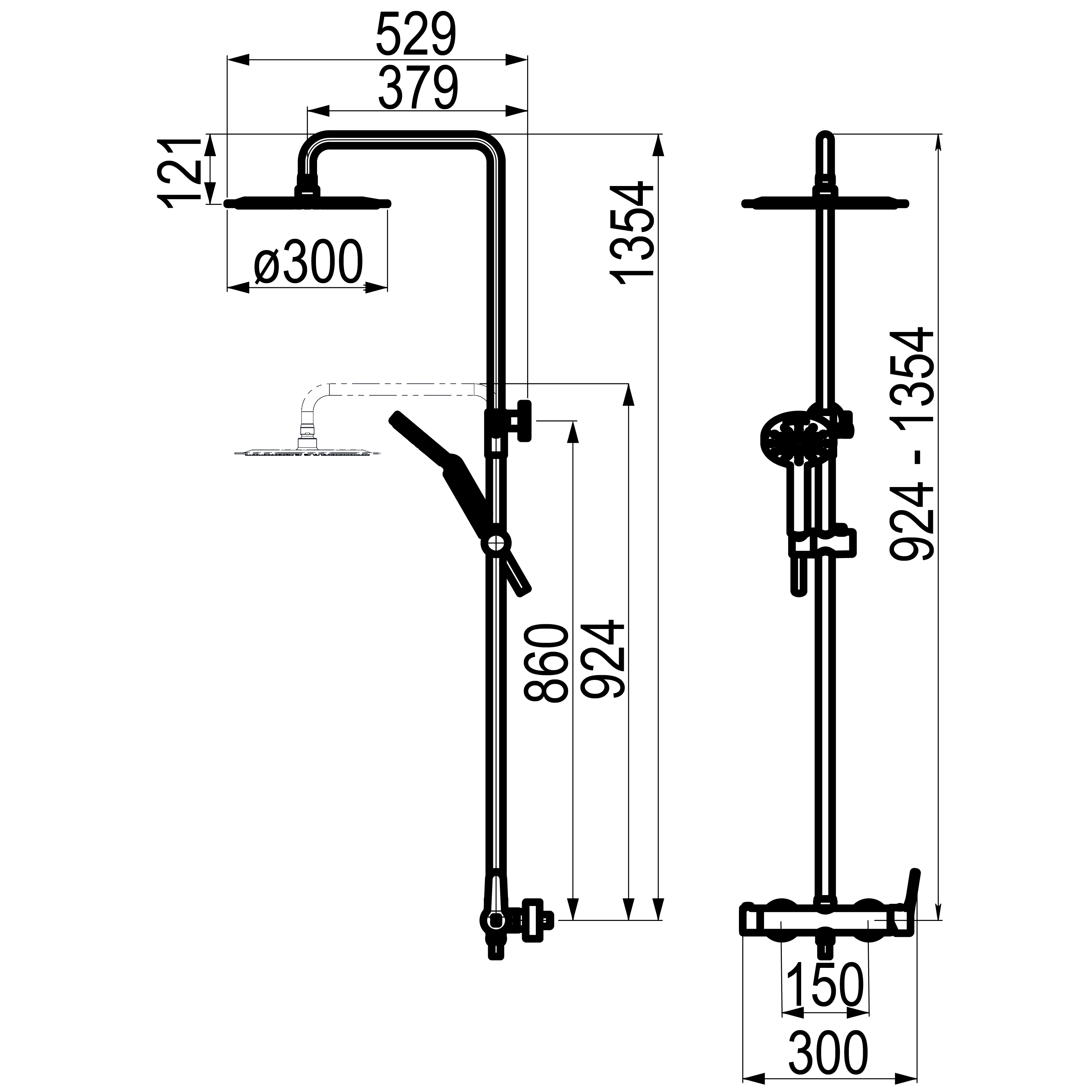 Rociador Ø300 mm inox,flexo PVC y maneral Aroha 3 f.