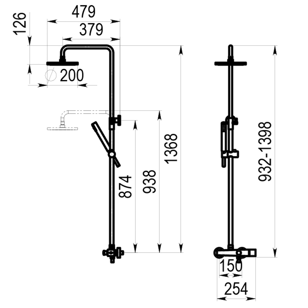 Columna ducha mezcladora Koa rociador 200 mm ABS, flexo inox y maneral nitro 1 función oro pvd