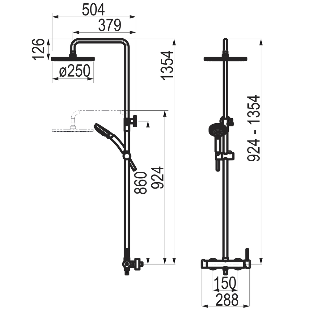 Grifo fabricado en latón con acabado cromado o cromo negro cepillado, según modelo. Columna regulable en altura (telescópica). Presión mínima de uso: 0,5 bar. Accionamiento mediante maneta monomando. Suministrado con rociador de diámetro 250 mm en ABS, flexo en PVC, maneral de ducha