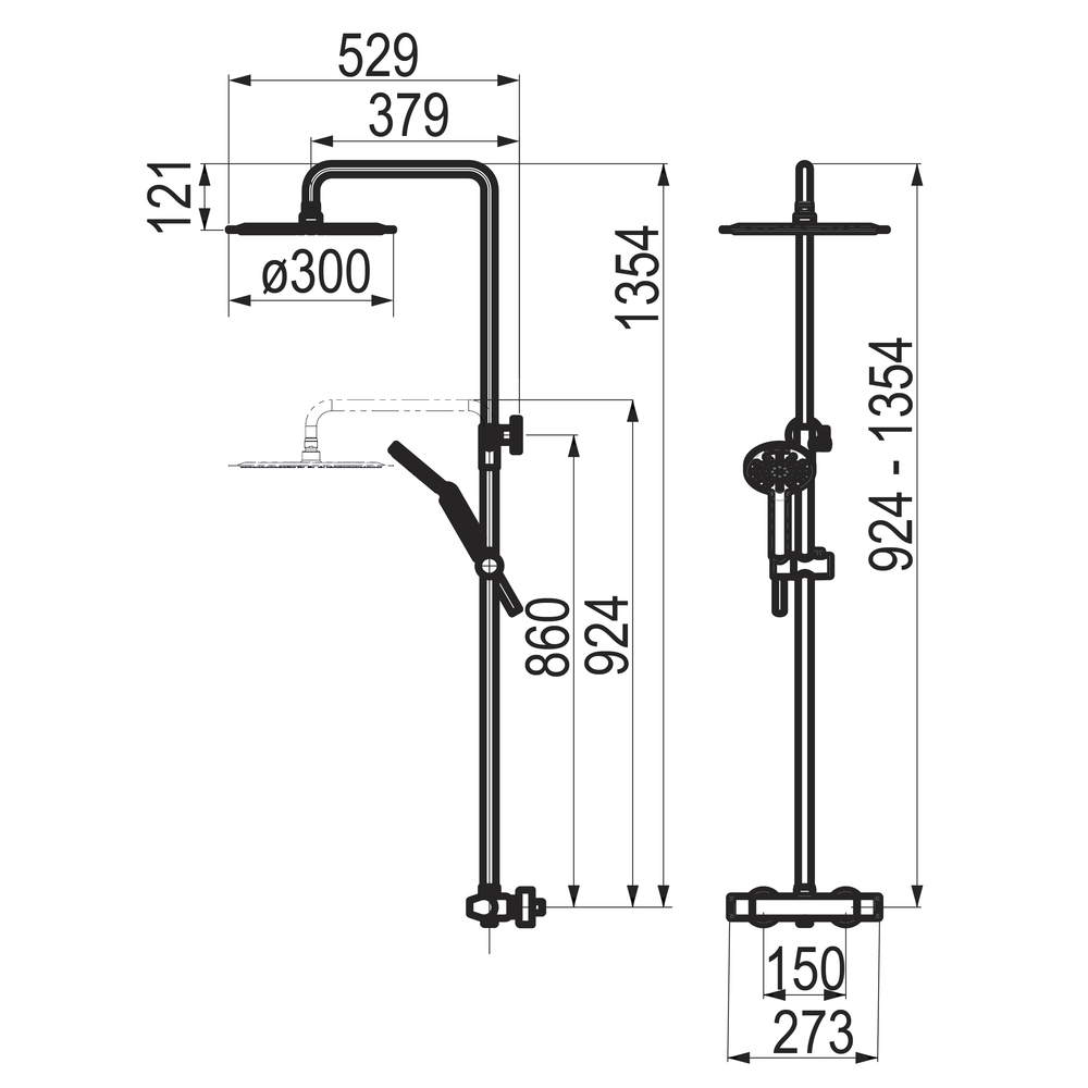 Grifo fabricado en latón con acabado cromo, blanco o negro,según modelo. Presión mínima de uso: 0,5 bar. Accionamiento mediante volante. Cuerpo frío. Termostato 1/2 vuelta. Diámetro termostato 25 mm. Montura cerámica distribuidora. Inversor integrado en mando. Suministrado con rociador de diámetro 300 mm en inox, flexo en PVC, maneral de ducha 5 funciones.