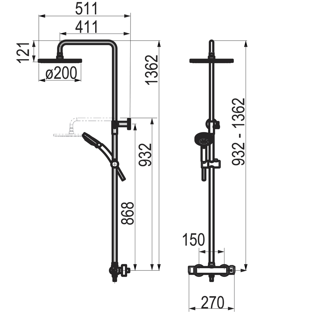 ^Grifo fabricado en latón con acabado cromado. Presión mínima de uso: 0,5 bar. Accionamiento mediante volante. Termostato 1/2 vuelta. Montura cerámica distribuidora. Inversor integrado en mando. Suministrado con rociador de diámetro 200 mm en latón, flexo en PVC, maneral de ducha 5 funciones.