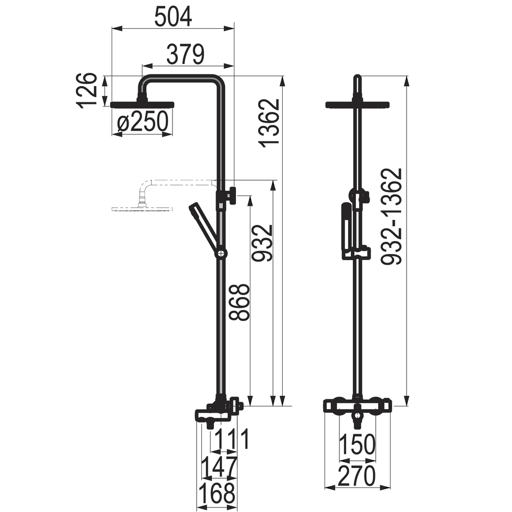 Grifo fabricado en latón con acabado cromado. Presión mínima de uso: 0,5 bar. Accionamiento mediante volante. Termostato 1/2 vuelta. Suministrado con rociador de diámetro 250 mm ABS, flexo en PVC, maneral de ducha 1 función.