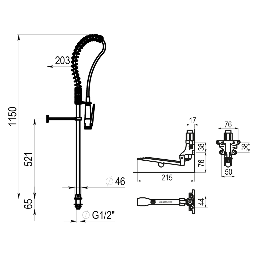 Columna industrial con brazo flexible forrado de plástico y grifo de pedal. Especialmente indicado para uso alimentario en cocinas profesionales e industria alimentaria.