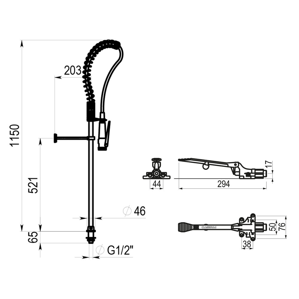 Columna industrial con brazo flexible forrado de plástico y grifo de pedal. Especialmente indicado para uso alimentario en cocinas profesionales e industria alimentaria.