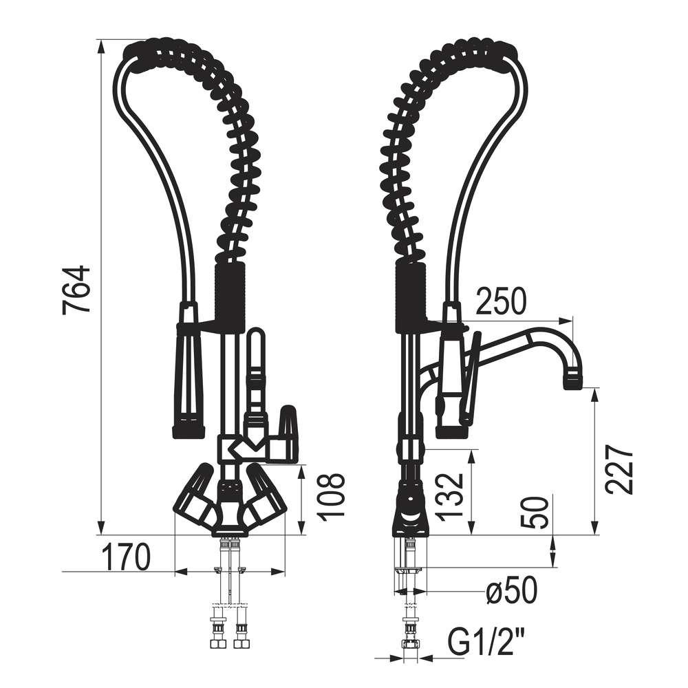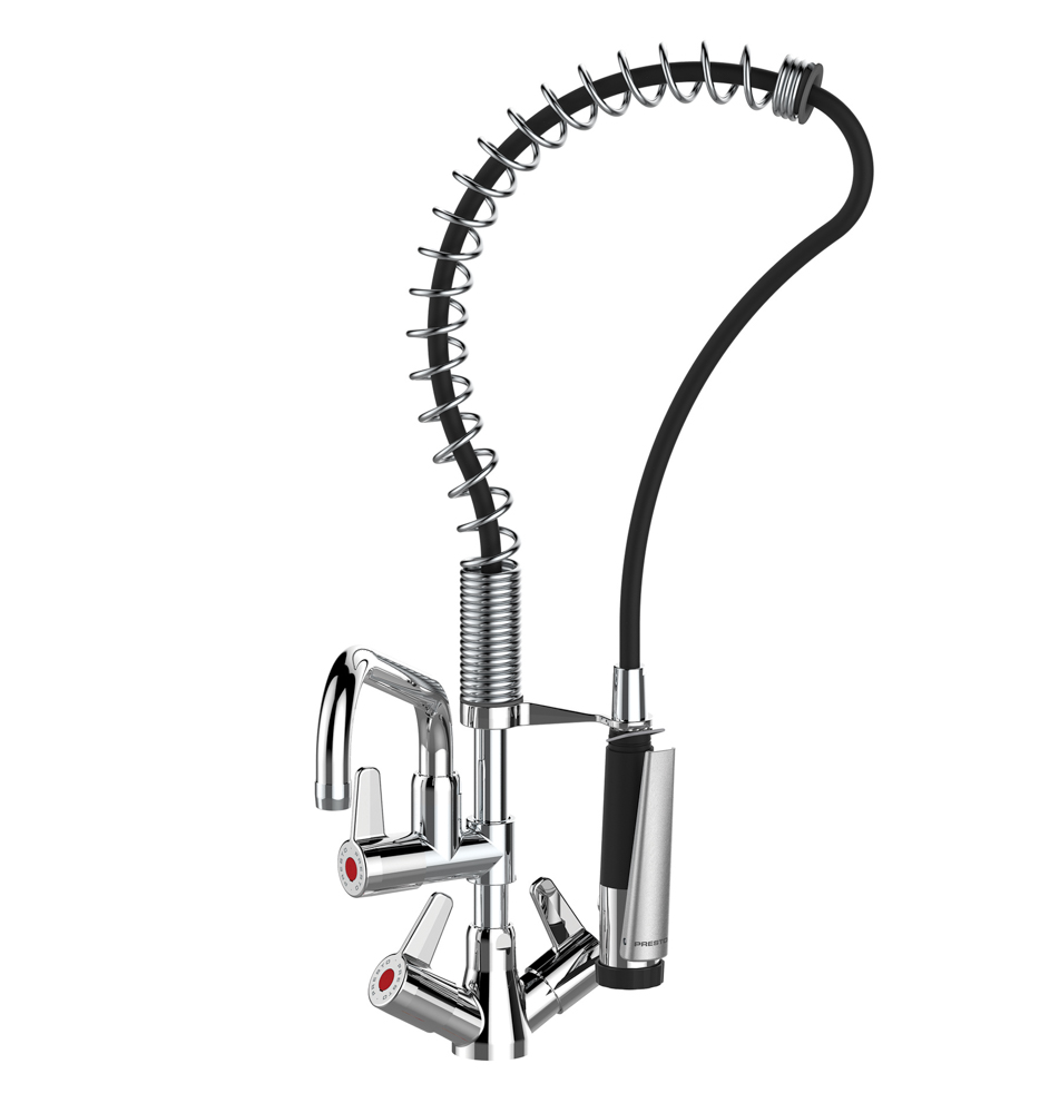 Grifo ducha industrial con regulación de chorro, mecanismo antichoque y cierre que evita los golpes de ariete. *Especialmente indicado para uso alimentario. *Cuerpos de latón y cromado de alta calidad y dureza. *Mando con montura cerámica. *Diseño bicolor negro y cromado. *Disponible con caño intermedio según modelo. *Brazo flexible de 1.000 mm con funda de PU para evitar nichos bacterianos y facilitar la limpieza. *Gancho de bloqueo para evitar MSD (trastornos musculoesqueléticos). *Caudal 12 l/min a 3 bar. *Cartucho sellado con discos cerámicos. *Presión de uso recomendada: 1 5 bar. *Entrada G1/2 hembra. *Accionamiento mediante maneta monomando. *El agua fluye hasta que el usuario lo detiene manualmente. *Temperatura admisible de agua: los materiales que componen las piezas de los grifos pueden soportar una temperatura máxima de 75ºC durante 30 mins máximo. *Suministrado con los elementos de fijación y conexión.