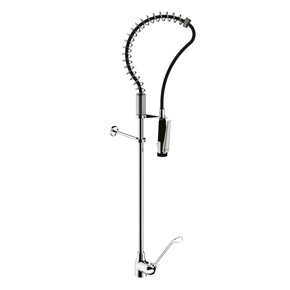 Grifo ducha industrial con regulación de chorro, mecanismo antichoque y cierre que evita los golpes de ariete. *Especialmente indicado para uso alimentario. *Cuerpos de latón y cromado de alta calidad y dureza. *Mando con montura cerámica. *Diseño bicolor negro y cromado. *Disponible con caño intermedio según modelo. *Brazo flexible de 1.000 mm con funda de PU para evitar nichos bacterianos y facilitar la limpieza. *Gancho de bloqueo para evitar MSD (trastornos musculoesqueléticos). *Caudal 12 l/min a 3 bar. *Cartucho sellado con discos cerámicos. *Presión de uso recomendada: 1 5 bar. *Entrada G1/2 hembra. *Accionamiento mediante maneta monomando. *El agua fluye hasta que el usuario lo detiene manualmente. *Temperatura admisible de agua: los materiales que componen las piezas de los grifos pueden soportar una temperatura máxima de 75ºC durante 30 mins máximo. *Suministrado con los elementos de fijación y conexión.