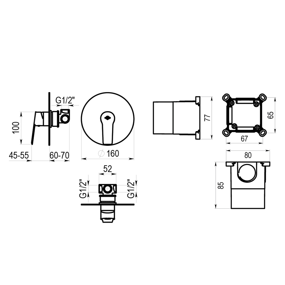 Conjunto de ducha monomando con grifo empotrado, maneral, toma de agua, flexo y barra de ducha.