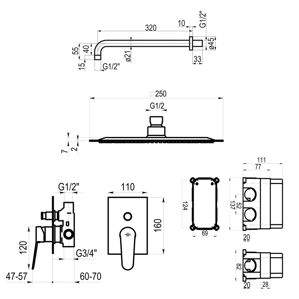 Conjunto de ducha monomando de 2 vías con grifo empotrado y accesorios de ducha.