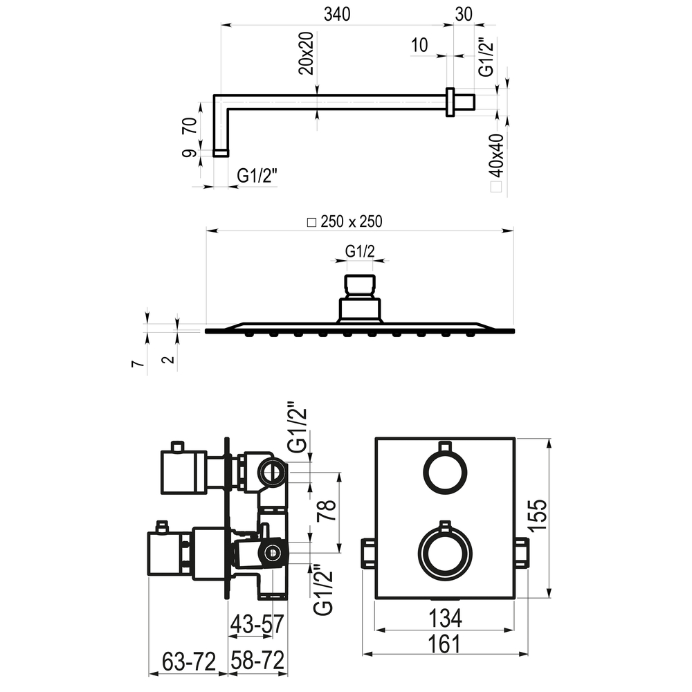 ^Conjunto de ducha termostático fabricado en latón con acabado cromado o negro. Compuesto de grifo empotrado, maneral, toma de agua, flexo, rociador y brazo de ducha. Placa embellecedora regulable. Accionamiento mediante volantes. Cartucho termostático. Presión mínima de uso: 0,5 bar. Entrada G1/2 macho de 2 entradas y 2 salidas. Temperatura admisible de agua: los materiales que componen las piezas de los grifos pueden soportar una temperatura máxima de 70ºC. Suministrado con: placa embellecedora.