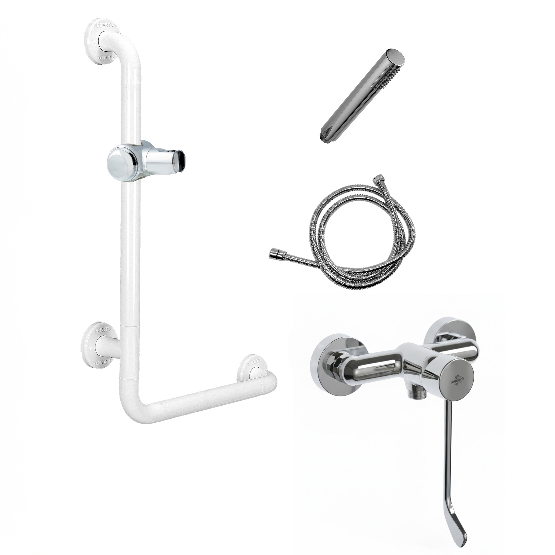 Conjunto ducha mezclador gerontológico INGO con barra de apoyo ángulo y accesorios de ducha.