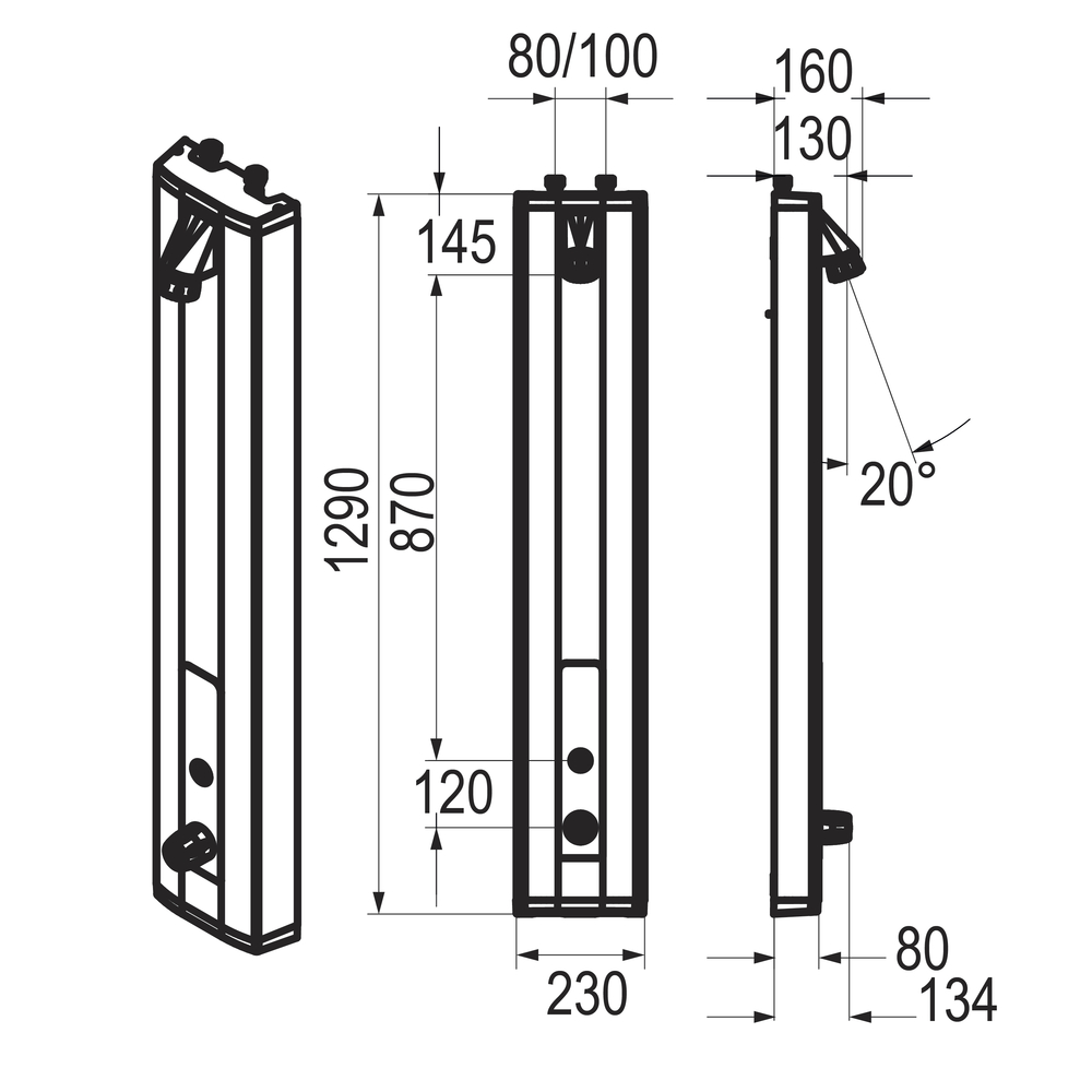 Placa desmontable de aluminio pintado RAL 7005. *Tapas de cierre de alta resistencia ABS RAL 7005. *Presión de uso recomendada: 1 a 5 bar. *Dispositivo contra golpe de ariete integrado. *Cabezal de ducha fijo con dirección orientable y orificios antical. *Modelo con batería de litio de 6V CRP2. *Perfil aluminio de 2,5 mm pintado y cabezales en ABS de alta resistencia. *Temperatura máxima de seguridad prefijada: 38 °C. *Seguridad anti quemaduras: parada instantánea de agua caliente en caso de fallo de agua fría. *Sistema de seguridad que corta la salida de agua en caso de fallo en el suministro de agua fría. *Fácil mantenimiento.