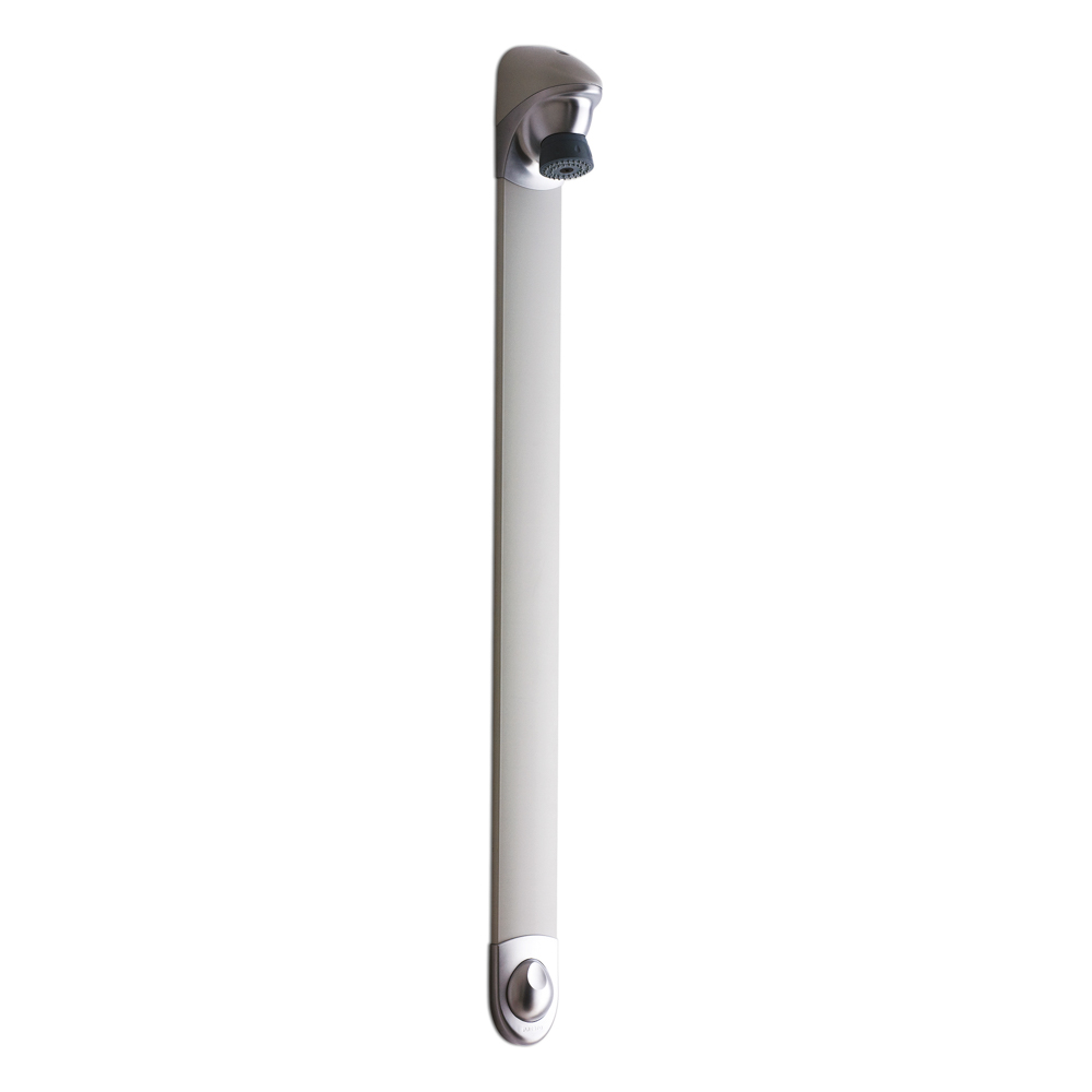 Conjunto de grifo temporizado de un agua para instalación vista con rociador orientable y regulador automático de caudal.