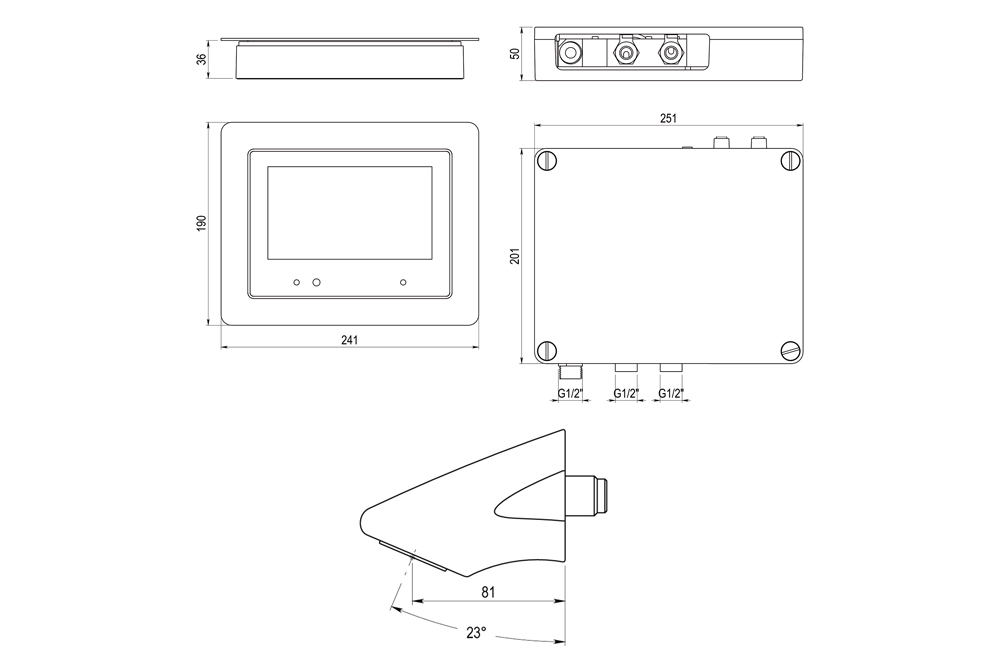 ^Pantalla Táctil. *Conexión Wi Fi. *Conexión bluetooth para intercambio de archivos. *Sensor de presencia. *Visualización de foto/vídeo/audio. *Presentación de publicidad. *Restricción por usuarios. *Control a distancia mediante software. *Control de usos y horarios de funcionamiento. *Control por voz. *Conexión directa a 220 V mediante transformador suministrado. *Presión recomendada de uso uso de 2 a 5 bar. En instalaciones con mayor presión instalar reductor de presión. *Presión máxima: 5 bar. *Temperatura de uso máxima recomendada: 70ºC.