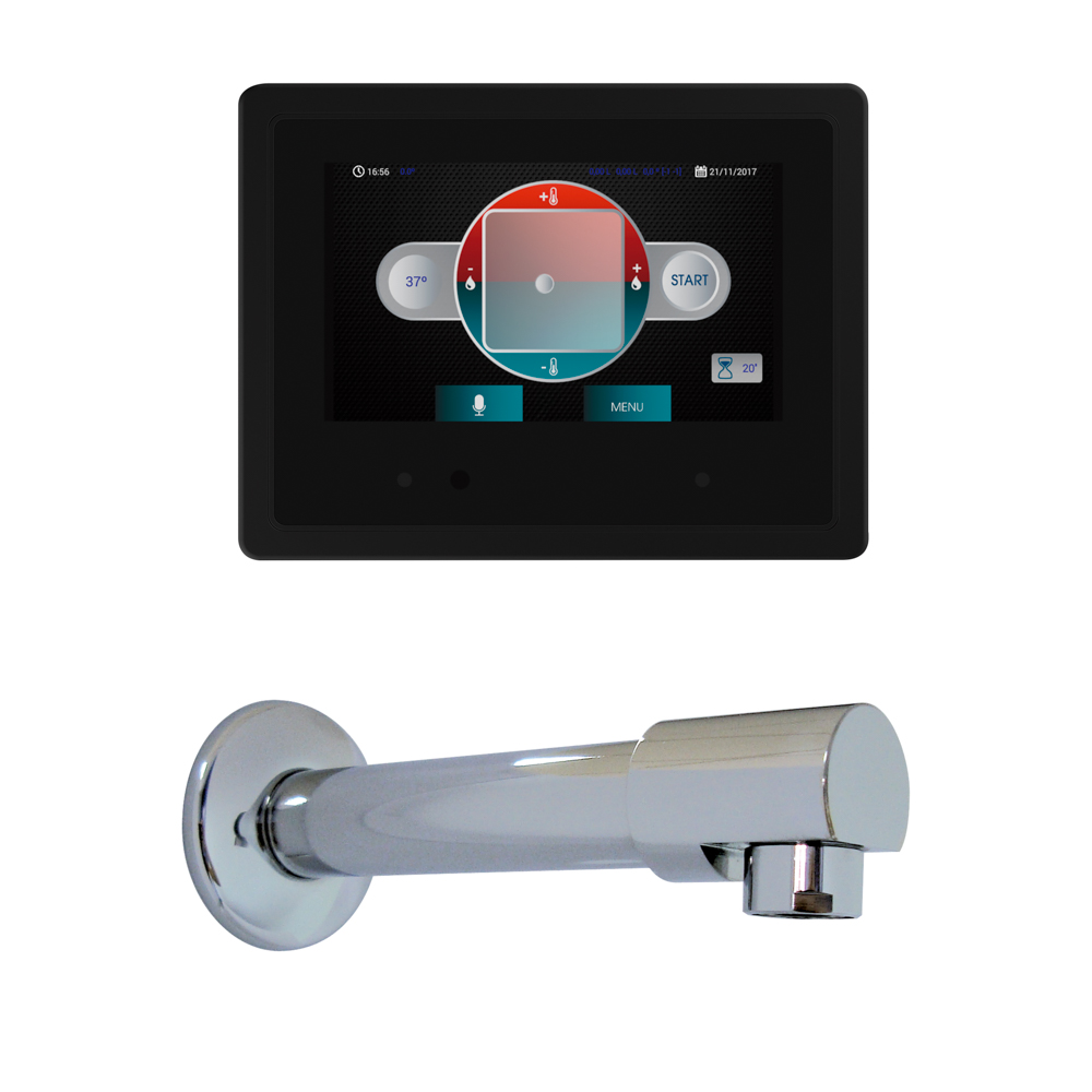 Conjunto de solución completa con sistema inteligente de grifería para lavabo Grifo electrónico PRESTO DRE@MS con pantalla táctil para instalación vista y caño mural ECO.