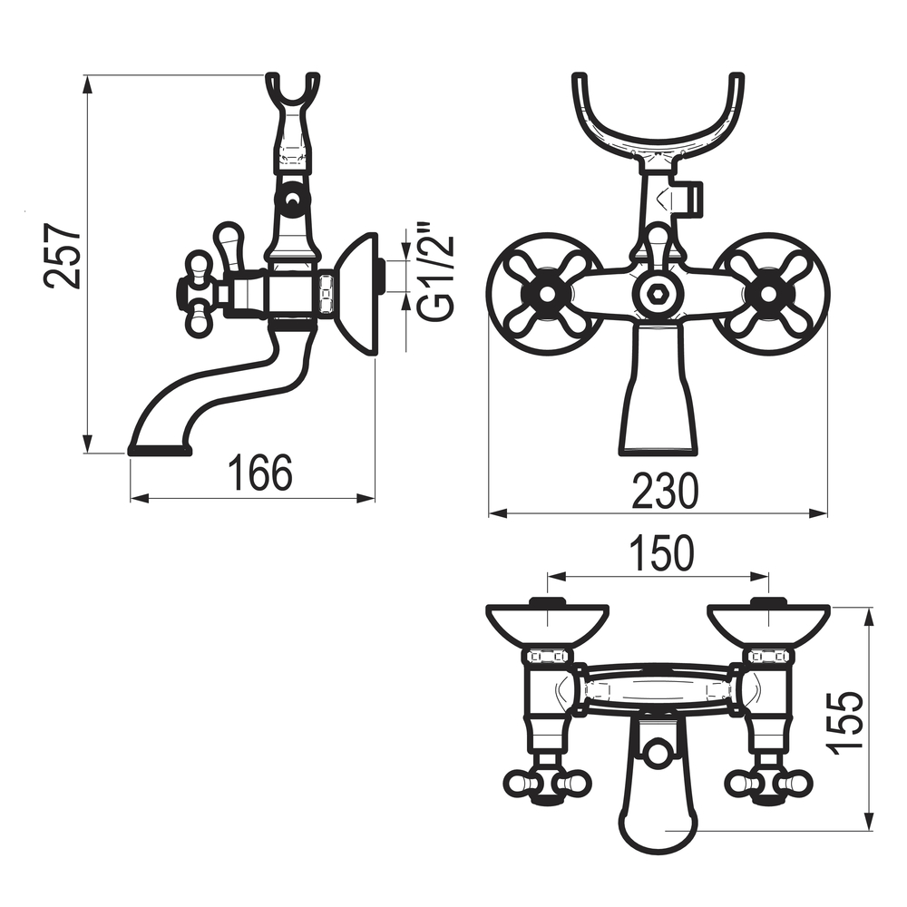 Grifo bimando baño-ducha para instalación mural visto.