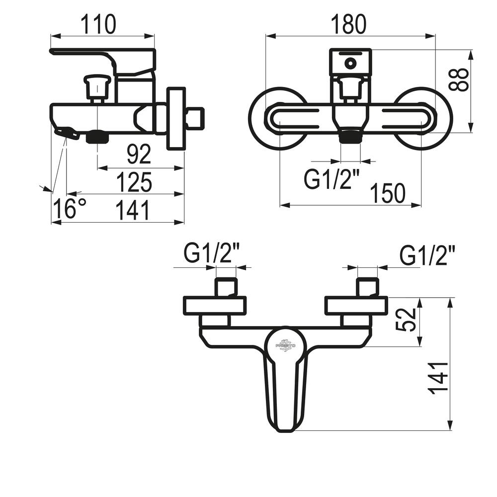 Grifo monomando de baño-ducha mezclador mural visto.