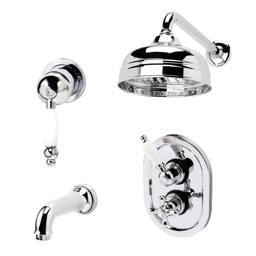 Conjunto de baño-ducha termostático de 2 vías con grifo empotrado y accesorios.