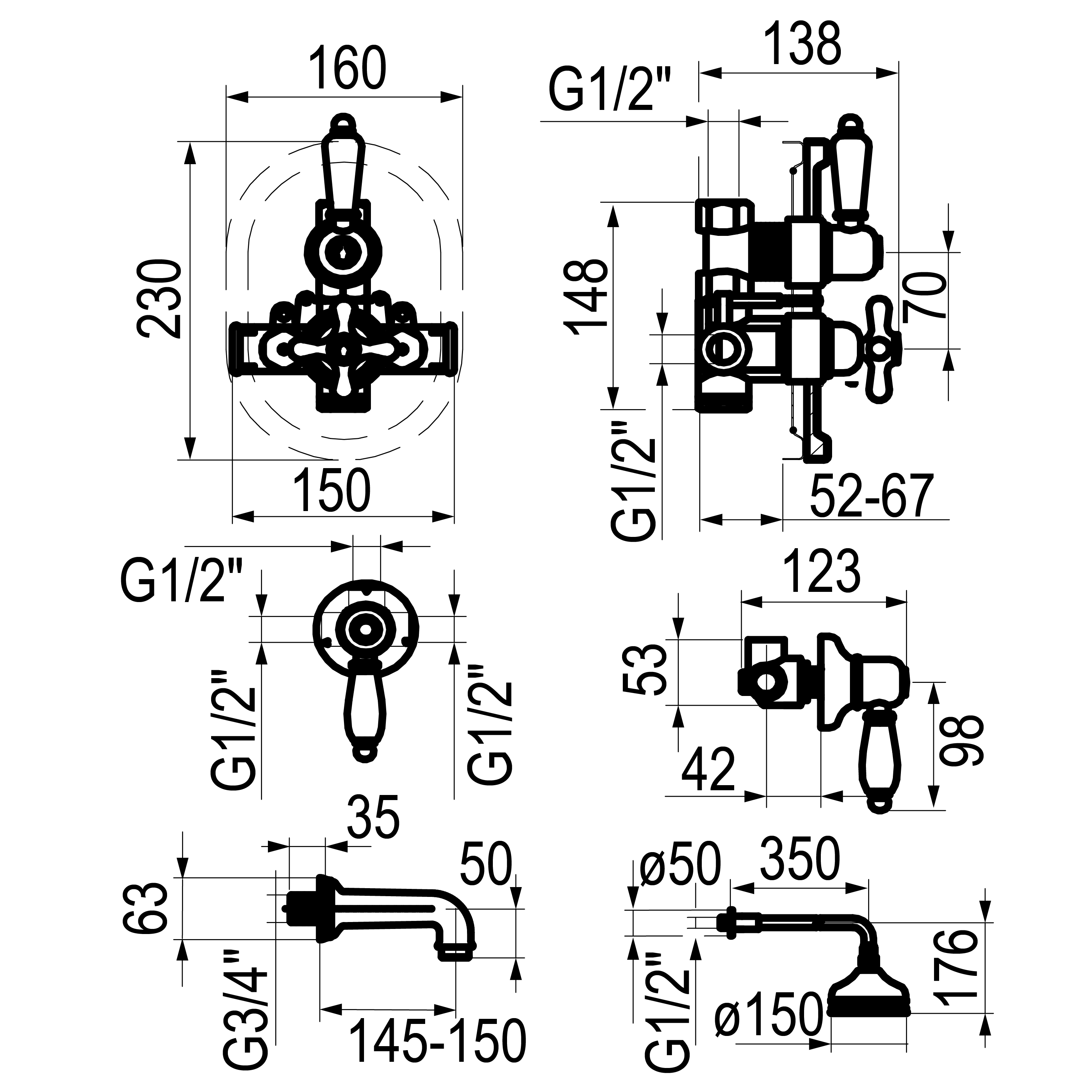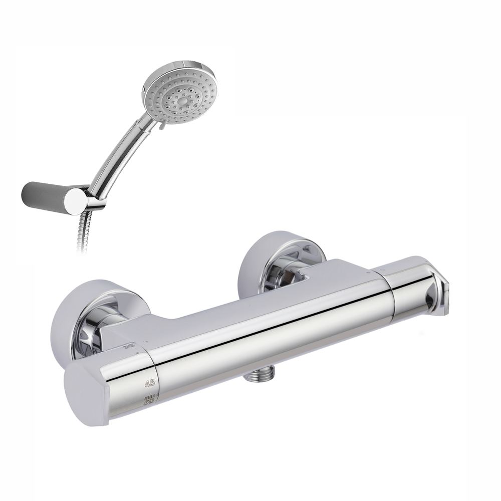 Grifo fabricado en latón con acabado cromado. Presión mínima de uso: 0,5 bar. Accionamiento mediante volante. Cartuchos termostáticos. Diámetro termostato 25 mm. Montura cerámica distribuidora. Entrada 1/2 Hembra. Acabados existentes: cromo y bronce.