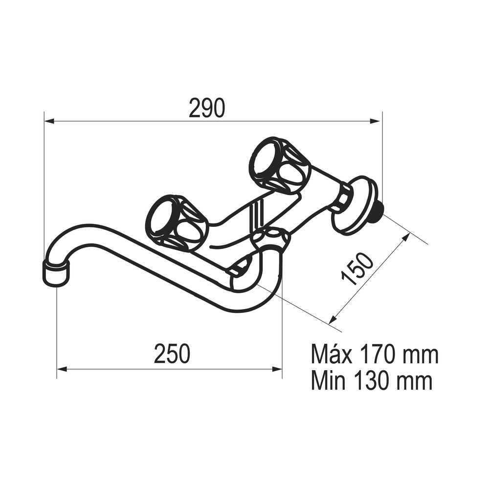 Grifo bimando de cocina con caño inferior de 25 cm instalación mural.