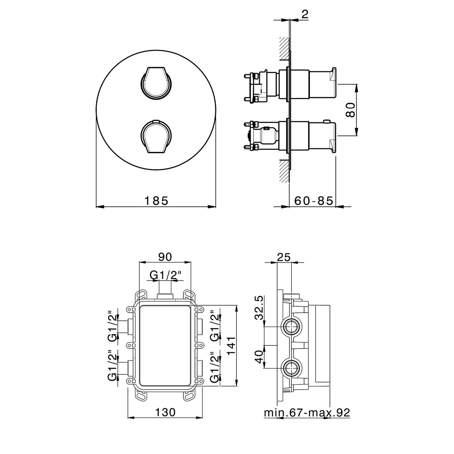 Grifo termostático ducha de 2 vías para instalación mural empotrable con caja universal empotrable.