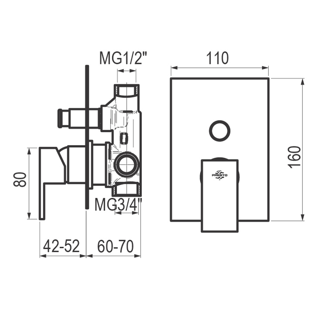 Grifo monomando ducha 2 vías para instalación mural empotrable.