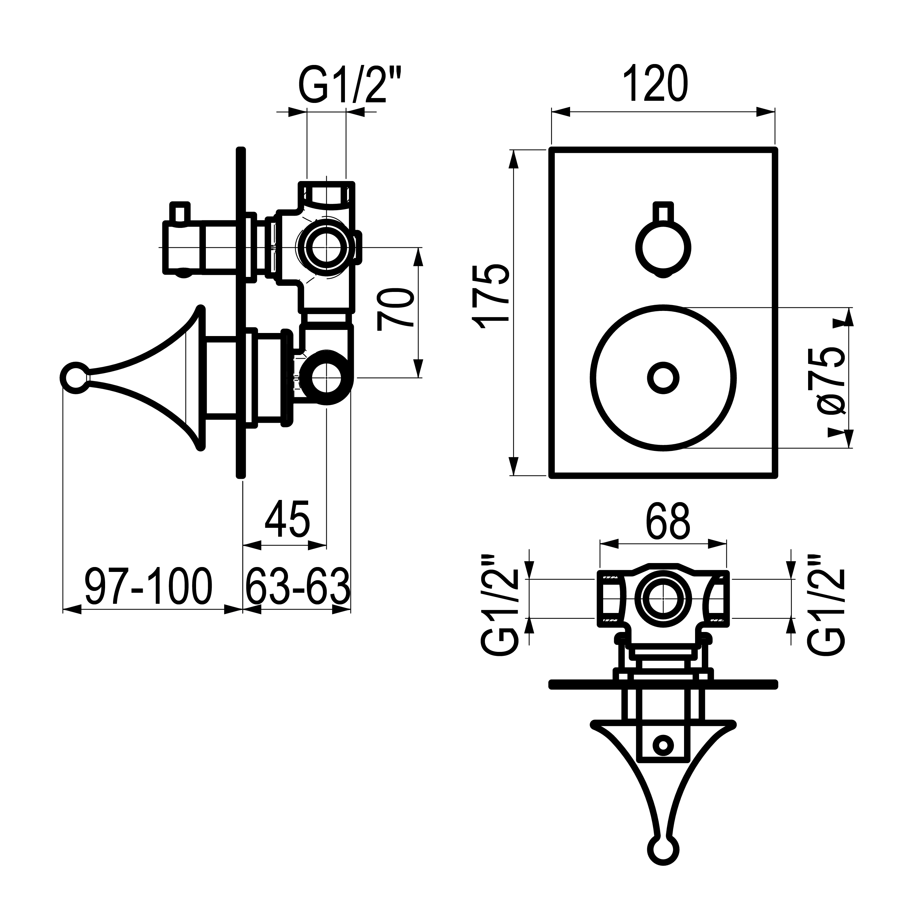 Grifo monomando ducha 3 vías para instalación mural empotrable.