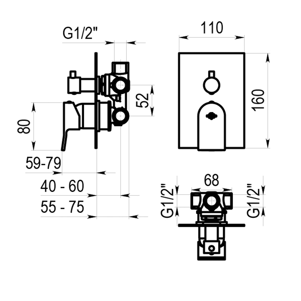 Grifo monomando ducha 3 vías para instalación mural empotrable.