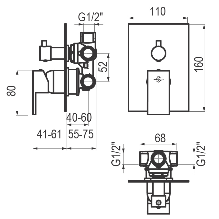Grifo monomando ducha 3 vías para instalación mural empotrable.