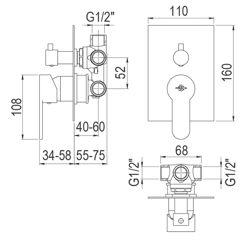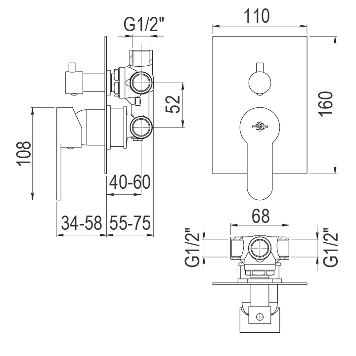 Grifo monomando ducha 3 vías para instalación mural empotrable.