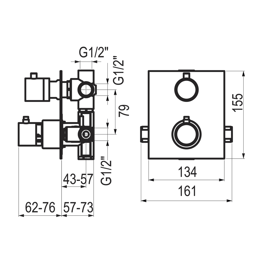 ^Grifo fabricado en latón con acabado cromado. Presión mínima de uso: 0,5 bar. Accionamiento mediante volantes. Cartuchos termostáticos. Placa embellecedora regulable. Acabado Cromo. Suministrado: Sin accesorios de ducha.