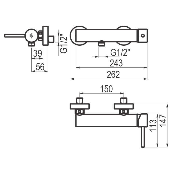 Grifo monomando de ducha para instalación mural visto.