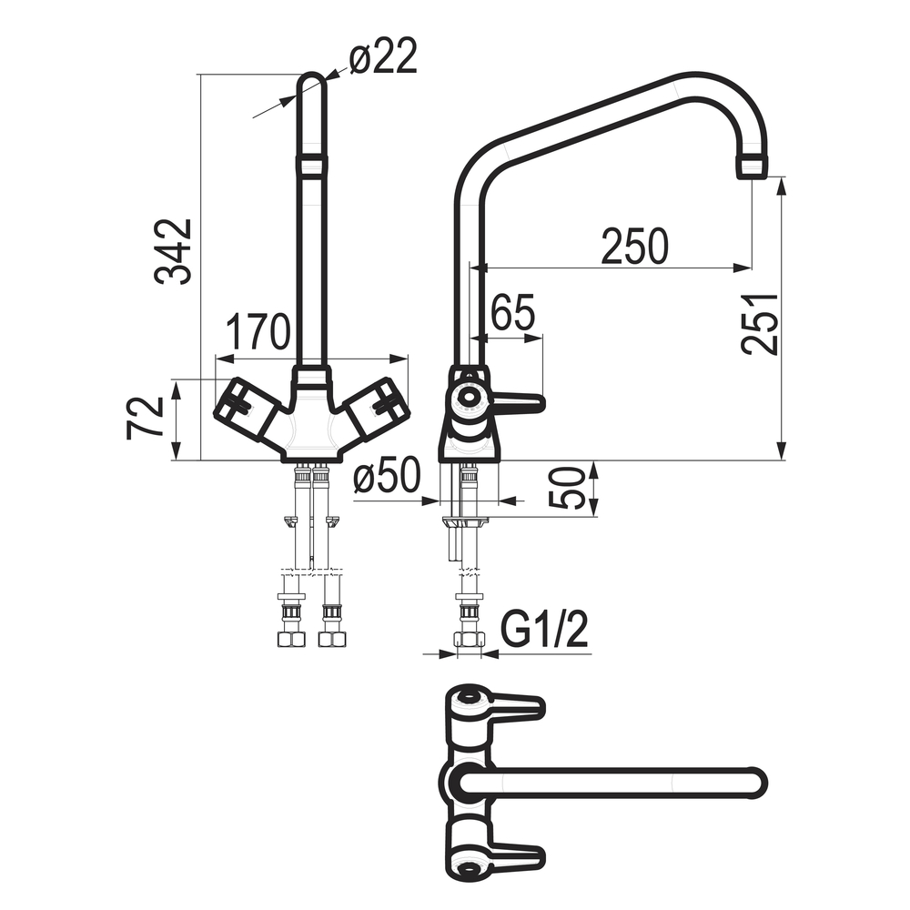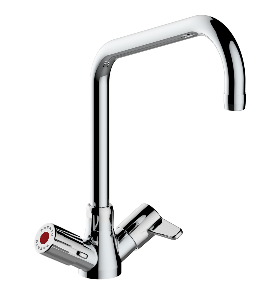 Grifo bimando para instalación sobre repisa con caño reforzado. *Resistente al uso intensivo *Caño giratorio 360 ° con sistema antifricción que no causa desgaste prematuro en el uso intensivo. *Los flexibles son resistentes a las altas temperaturas. *Boquilla higiénica interior liso evitando la retención de agua y el desarrollo de las bacterias. *Cuerpo y caño en latón cromado. *Canaliza el agua y evita salpicaduras de agua laterales. *Caño alto para dejar pasar contenedores grandes. *Caudal 37 l/min a 3 bar y máxima apertura. *Cartucho cerámico giratorio 1/4 *Presión de uso recomendada: 1 5 bar. *Entrada G1/2 hembra. *Accionamiento mediante maneta bimando. *El agua fluye hasta que el usuario lo detiene manualmente. *Temperatura admisible de agua: los materiales que componen las piezas de los grifos pueden soportar una temperatura máxima de 75ºC durante 30 mins máximo. *Suministrado con: elementos de fijación,latiguillos flexibles y válvulas antirretorno.