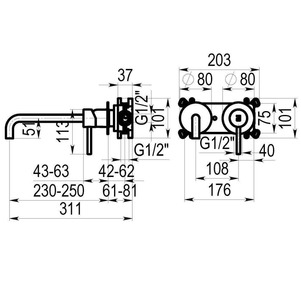 Grifo fabricado en latón con acabado cromado o cromo negro cepillado, según modelo. Presión mínima de uso: 0,5 bar. Accionamiento mediante maneta. Cuerpo para instalación en un único orificio. Cartucho sellado con discos cerámicos de diámetro 35 mm. Salida de agua mediante rótula dirigible.