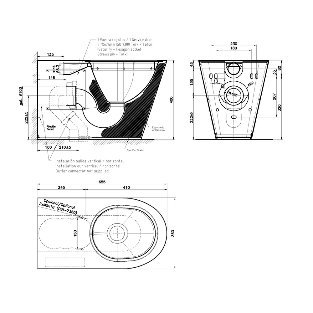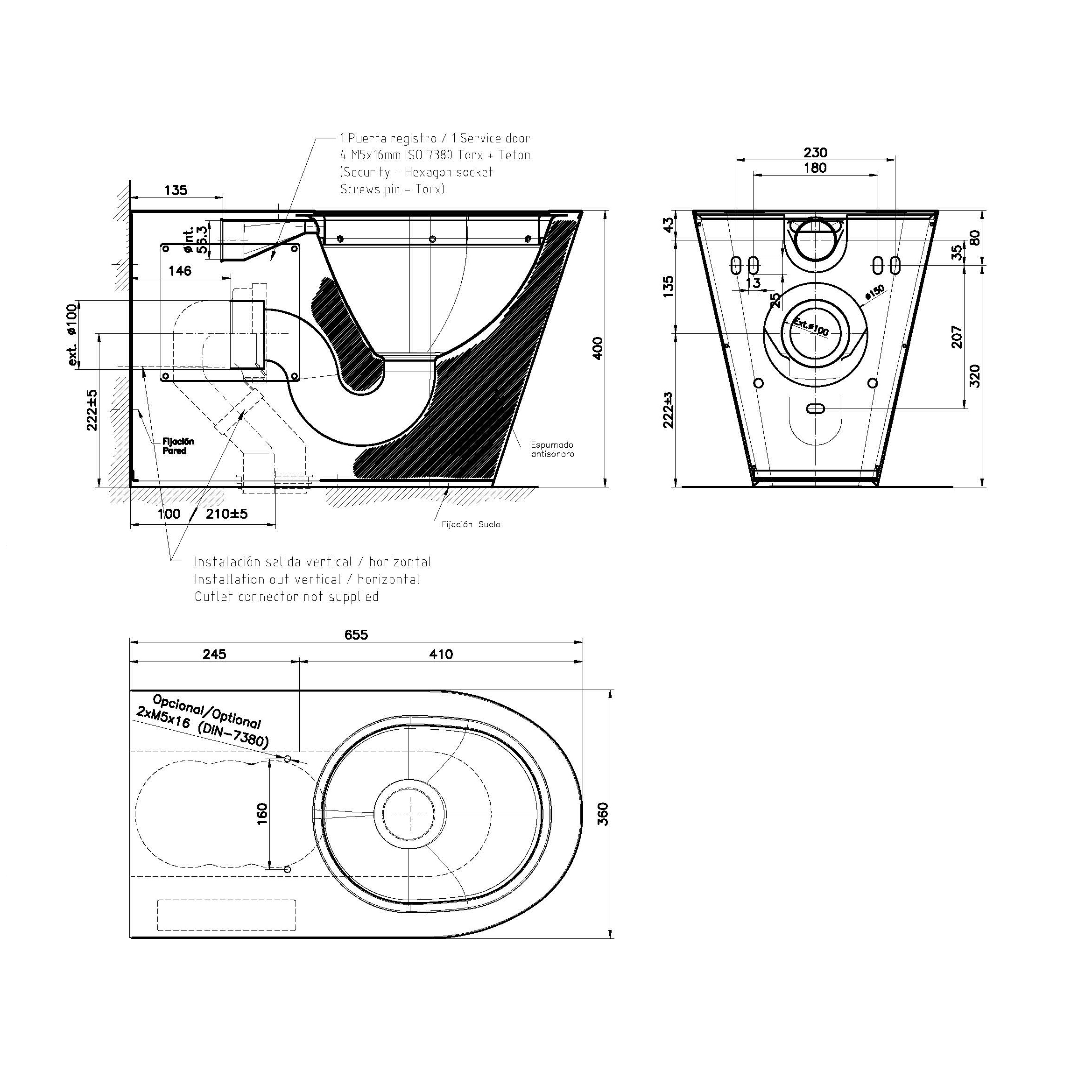 Especialmente diseñado para baños públicos. Cuenta con la certificación EN 997. Acabado envolvente que asegura un acabado más duradero. Acabado satinado que disminuye la adherencia de los sólidos. Taza del inodoro en acero inoxidable AISI 304 fabricada de una sola pieza mediante proceso de embutición. Taza con diseño redondo. Provisto de Desagüe a pared/suelo de Ø100 mm realizado en acero inoxidable AISI 304. Inodoro al suelo para su colocación al piso con envolvente troncocónica. Toma de agua encastrada de Ø 56 mm completamente realizada en acero inoxidable AISI 304. Provisto de un manguito de PVC para salida a suelo/pared. Fijación a pared y suelo. Dimensiones: 535 x 360 x 400 mm. Acabado satinado.