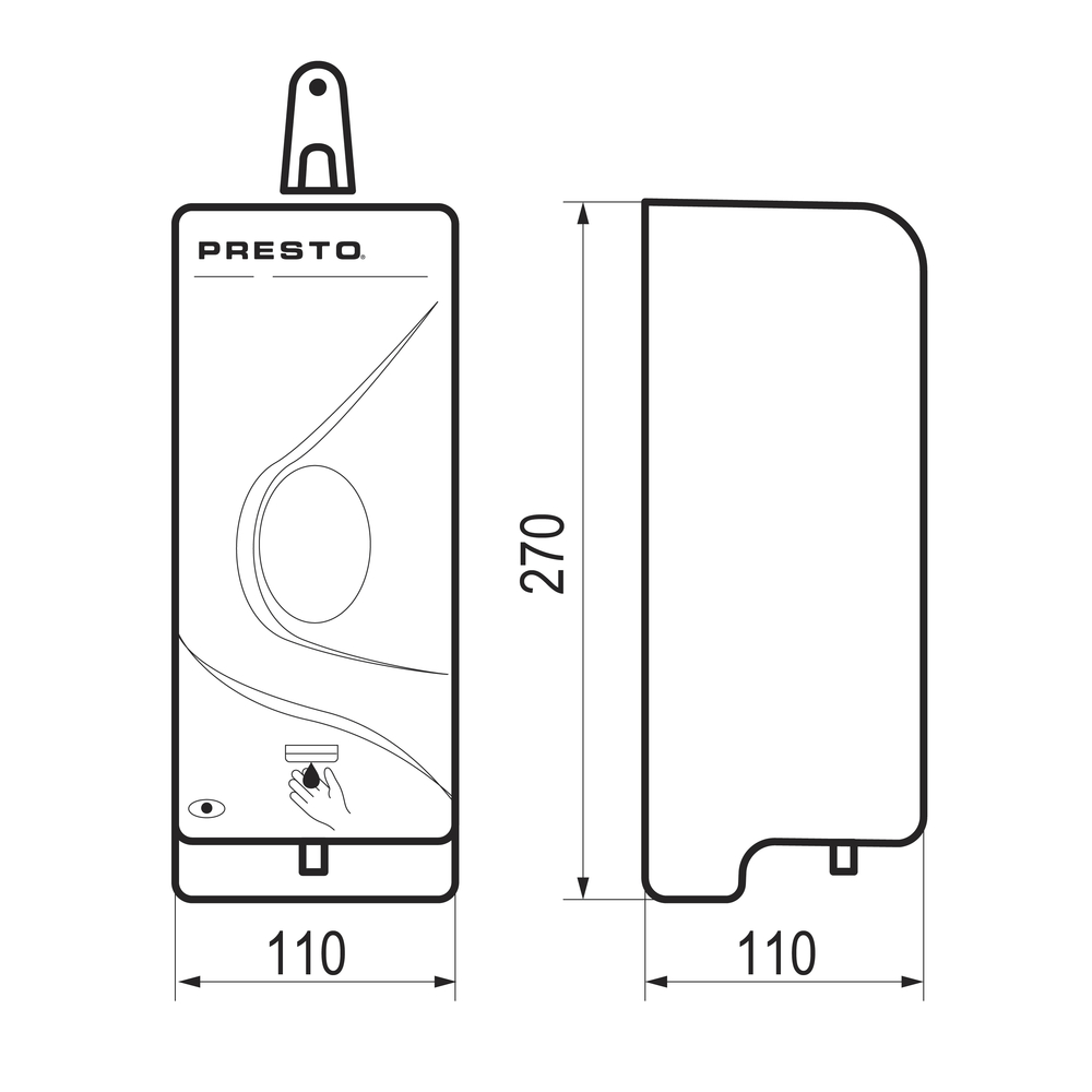 ^Carcasa exterior en ABS. Cierre asegurado por llave antivandálica suministrada. Ventana de control de nivel de jabón. Instalación en pared con tornillos o autoadhesivos. Alimentado con 3 pilas alcalinas de 1,5V R14. Duración de las pilas: 10.000 maniobras,equivalente aproximadamente a un año. Alcance de detección ajustable con el tornillo de Regulación. Fijación mural. Dimensiones: 270 x 110 x 110 mm.
