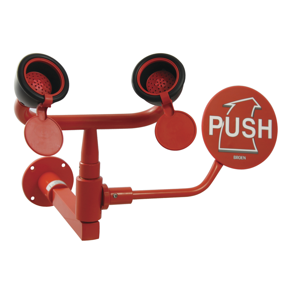 El sistema de seguridad pasa de cerrado a abierto en 1 segundo o menos y permanece abierto hasta que el usuario lo pare. Fabricado en latón con capa poliéster resistente a productos químicos. Lava ojos con dos salidas. Palanca de accionamiento de emergencia. Cumple con las normas EN 15154 y ANSI Z 358.1: 2004.