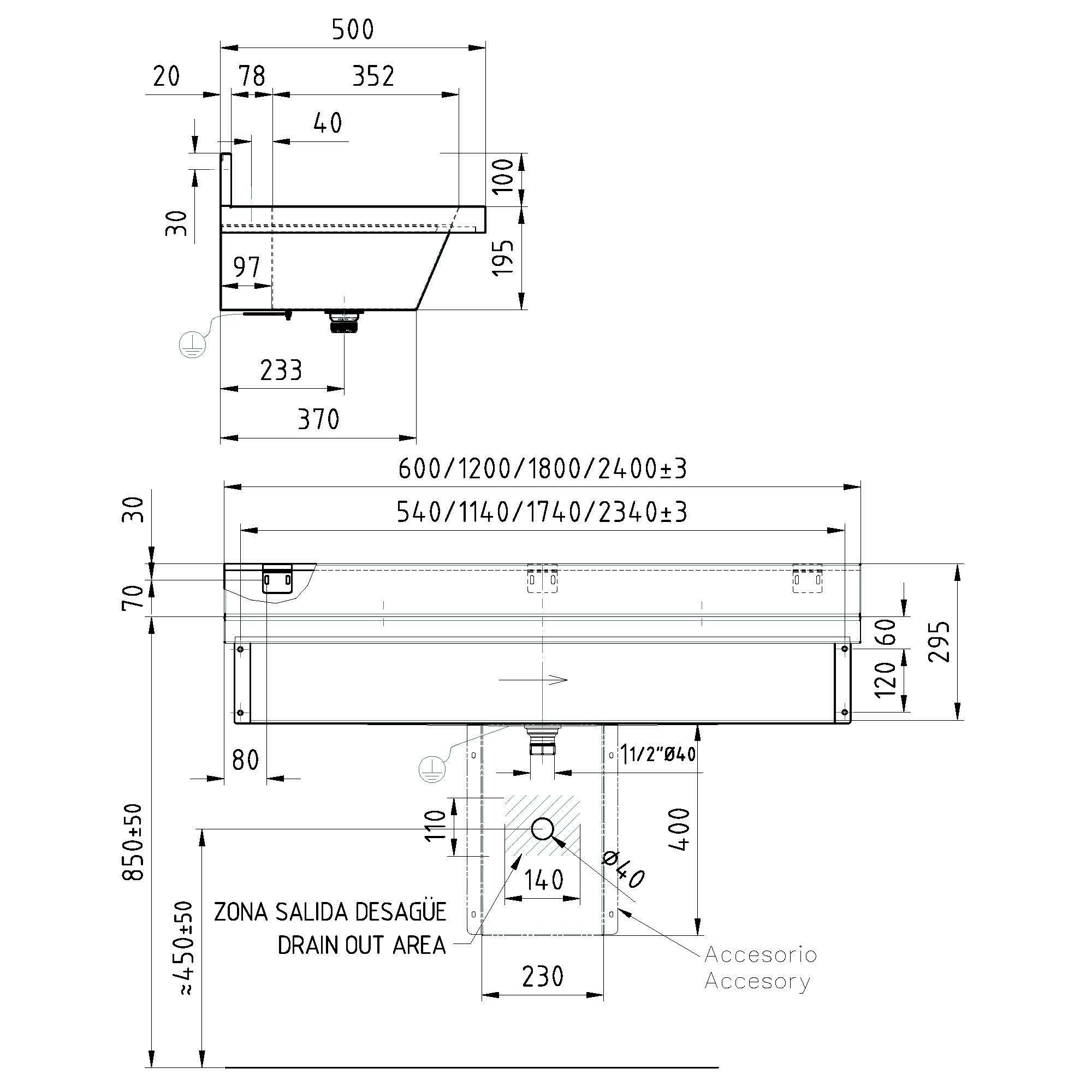 Lavabos íntegramente realizados en AISI 304. especialmente recomendado en aseos públicos altamente frecuentados. Fijación mural mediante tornillería. La altura de montaje recomendada es de 850 mm a 920 mm de altura del suelo. Sin Rebosadero. Orificio para grifería opcional. Se debe especificar el diámetro del orificio,22 mm o 35 mm. Grifería y Bote Sifónico no incluidos.