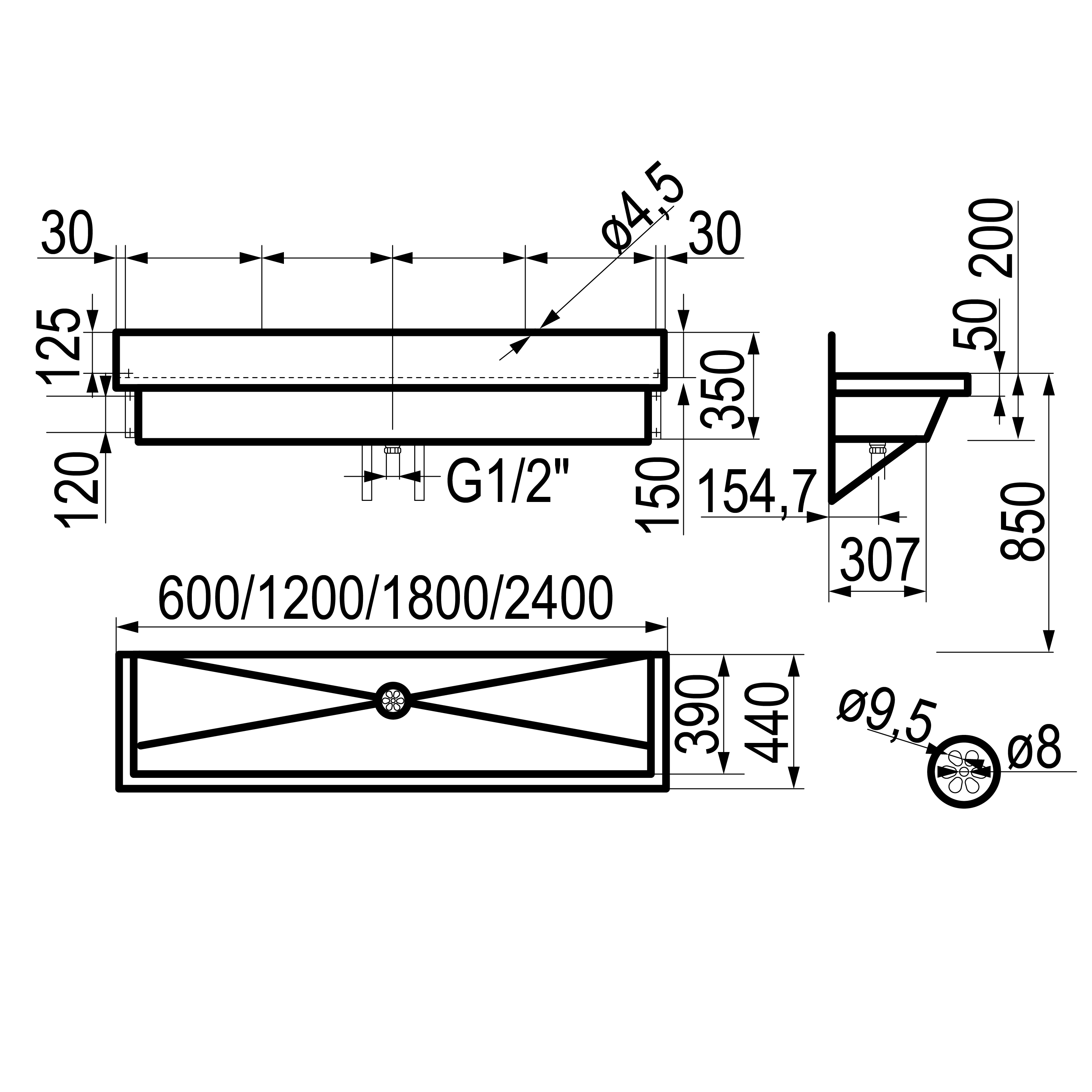 Lavabos íntegramente realizados en AISI 304. especialmente recomendado en aseos públicos altamente frecuentados. Fijación mural mediante tornillería. La altura de montaje recomendada es de 850 mm a 920 mm de altura del suelo. Sin Rebosadero. Orificio para grifería opcional. Se debe especificar el diámetro del orificio,22 mm o 35 mm. Grifería y Bote Sifónico no incluidos.