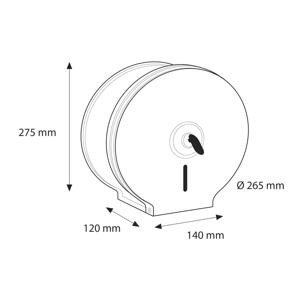 Dispensador de papel higiénico industrial o colectivo. Fabricado en acero inoxidable AISI 304. Acabado cromado. Visor de contenido. Cierre de seguridad antivandálico con llave. Adecuado para bobinas industriales de 240 m.