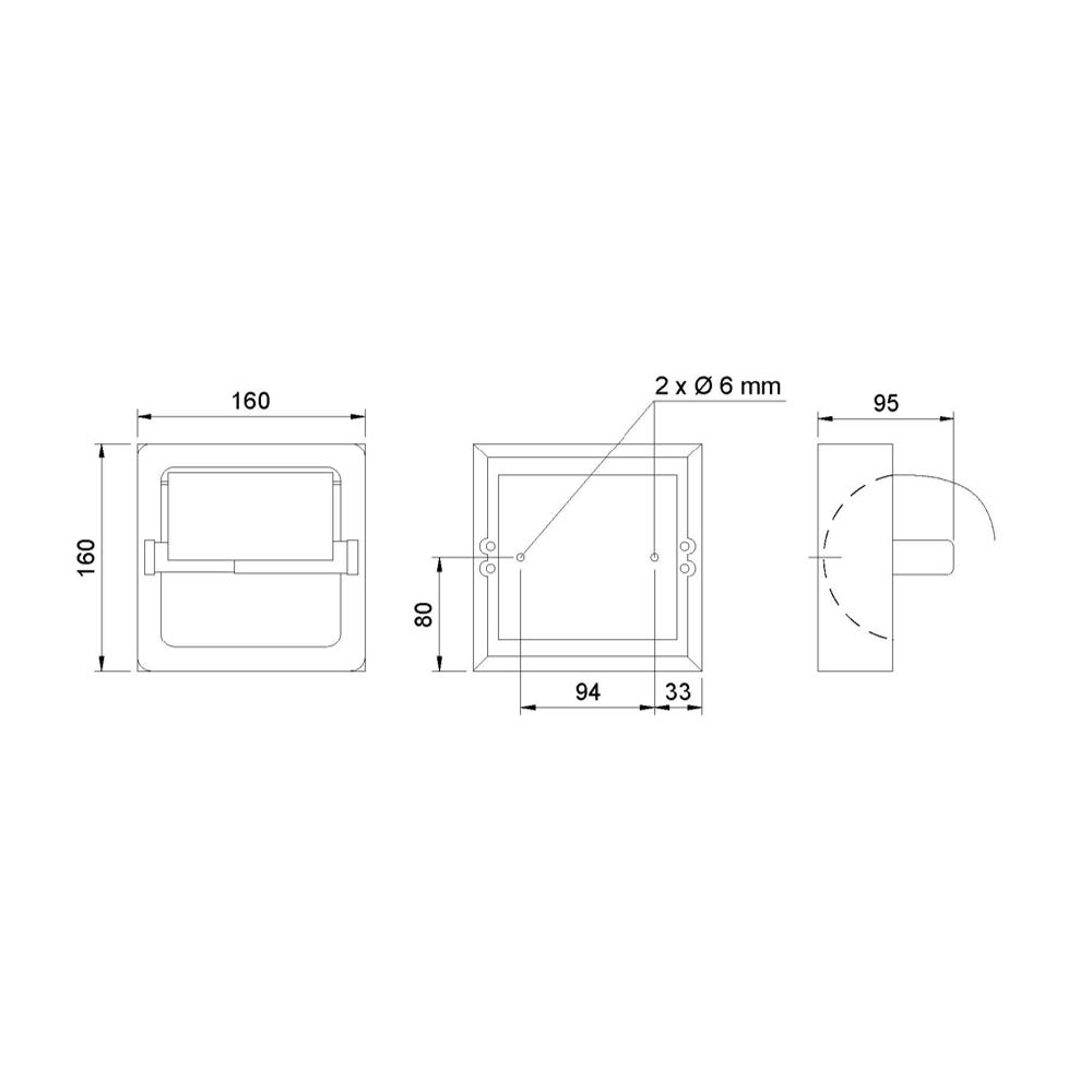 Empotrado mural. Fabricado en acero inoxidable AISI 304. Carcasa de cierre completo. Dimensiones embellecedor 155 x 165 mm. Dimensiones caja 135 mm alto x 70 mm fondo.