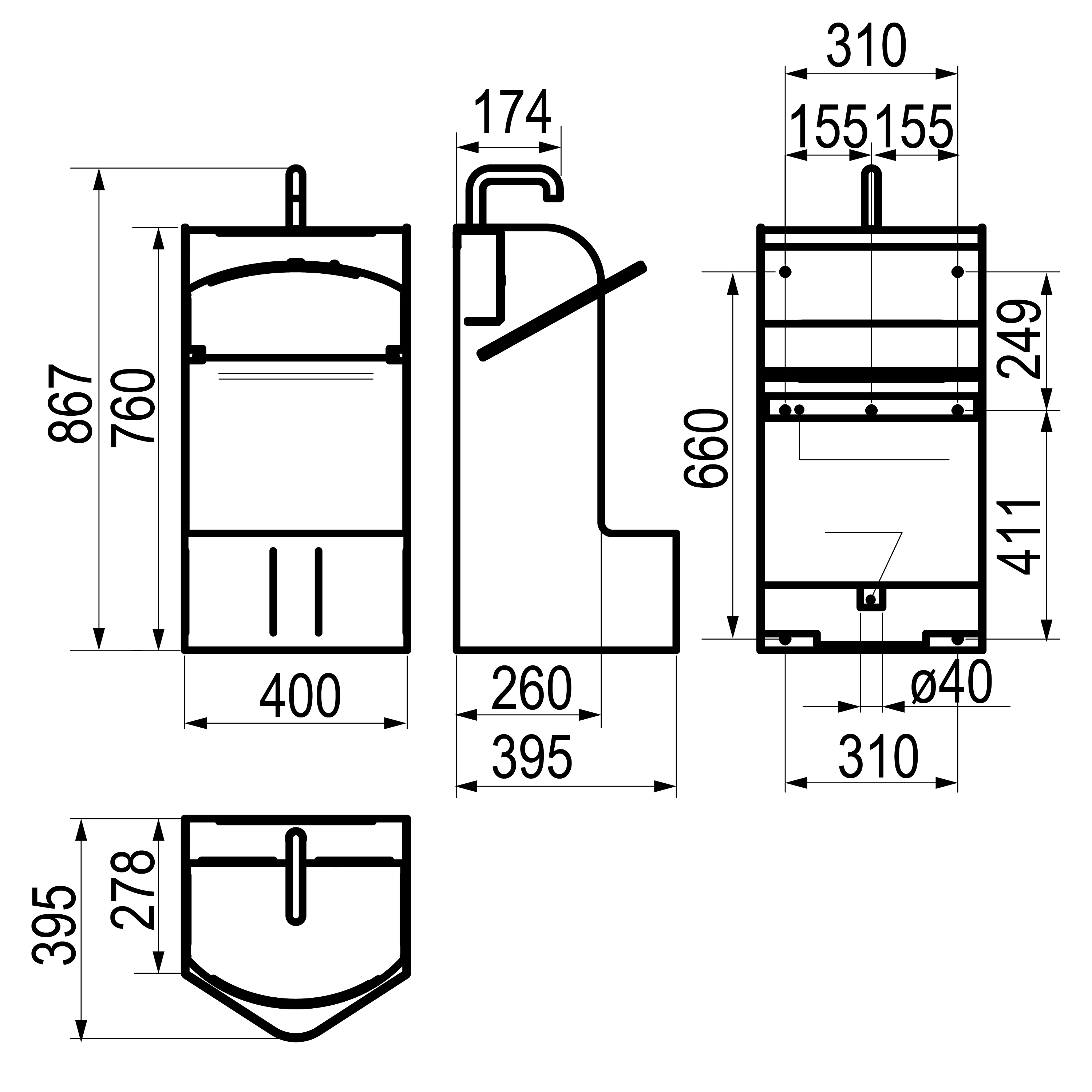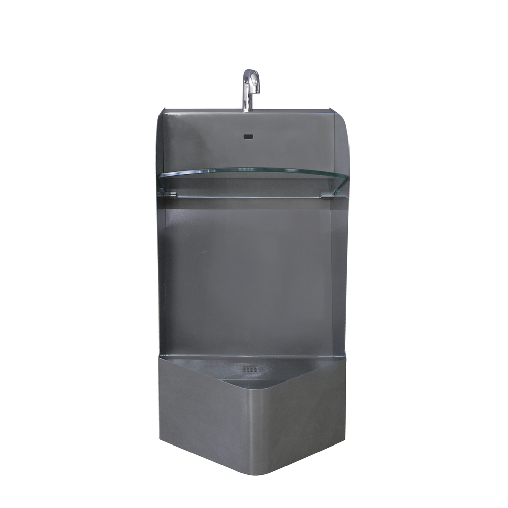 Con bandeja de cristal templado de alta resistencia. Lavabo electrónico integrado meclador mediante maneta integrada. Descarga hacia el urinario cuando el grifo detecte las manos del usuario próximas al sensor de detección. Alimentación mediante pila estándar CR 2 o transformador suministrados con el producto. Desagüe del equipo es de diámetro 40 mm.