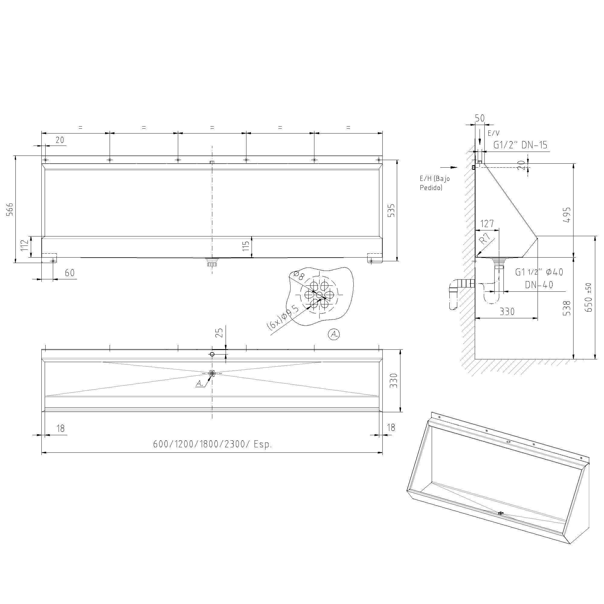 Urinario múltiple en Inoxidable 1200 mm.
