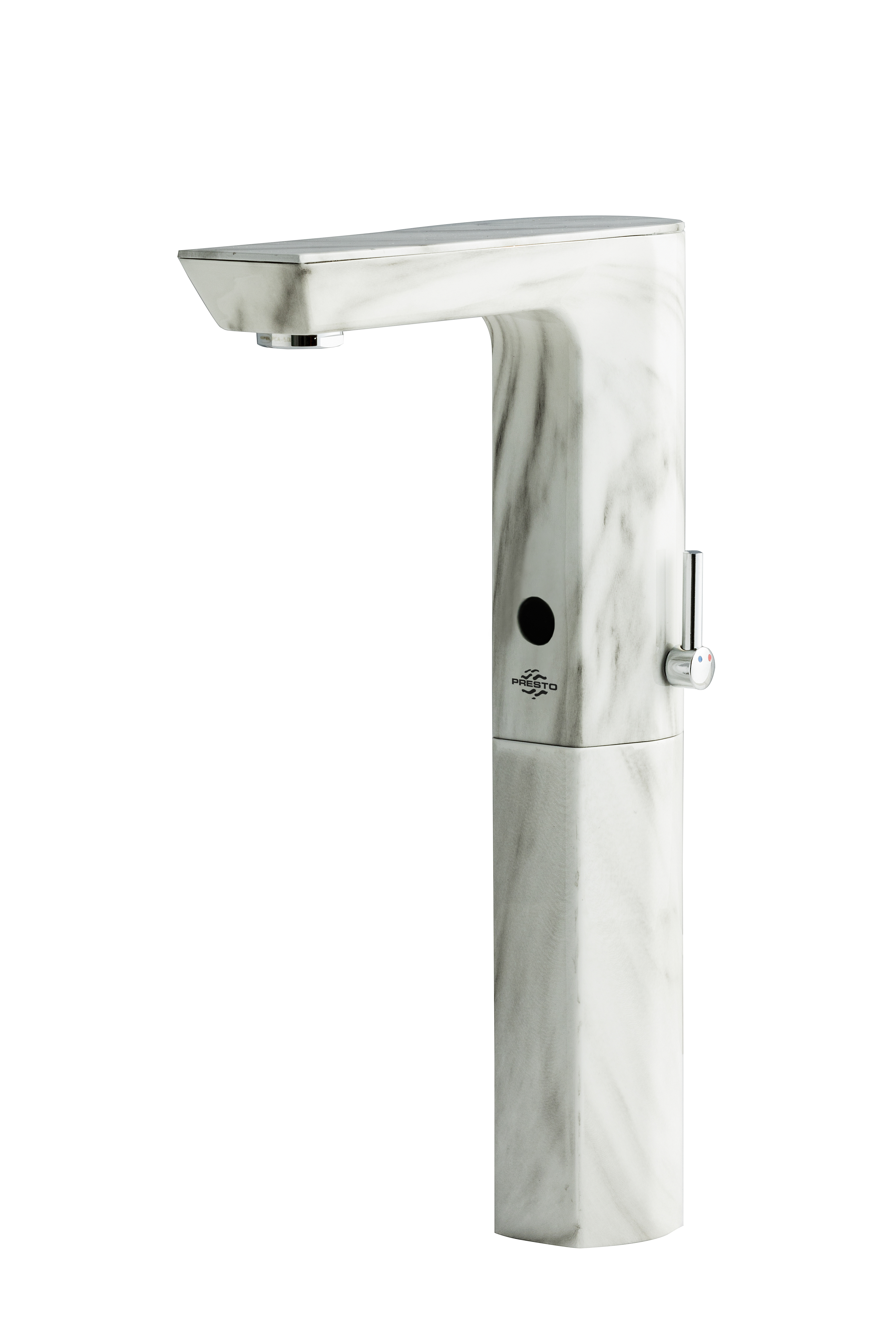 ^Grifo fabricado en latón con acabado disponible en mármol negro o mármol blanco. *Componentes integrados en el grifo para fácil instalación e incremento de protección antivandálica. *Cierre automático de la electroválvula en caso de fallo de alimentación eléctrica. *Aclarado automático cada 24h. *Indicación de batería baja mediante LED de comunicación, en modelo de pila. *Peso bruto: 1,086 kg. Caudal constante de 6 l/min (con presiones superiores a 1 bar). Cierre automático de la electroválvula en caso de fallo de alimentación eléctrica. Entrada G1/2 hembra. Temperatura admisible de agua: los materiales que componen las piezas de los grifos pueden soportar una temperatura máxima de 70ºC. Suministrado con: *Elementos de fijación, junta y arandela. *Latiguillo flexible de 350 mm, con tuercas de 1/2. *Pila CR P2 o transformador 12 V (según modelo). Presión de uso recomendada: 1 5 bar (min, 0.8 – max. 8 bar). Accionamiento mediante sensor.