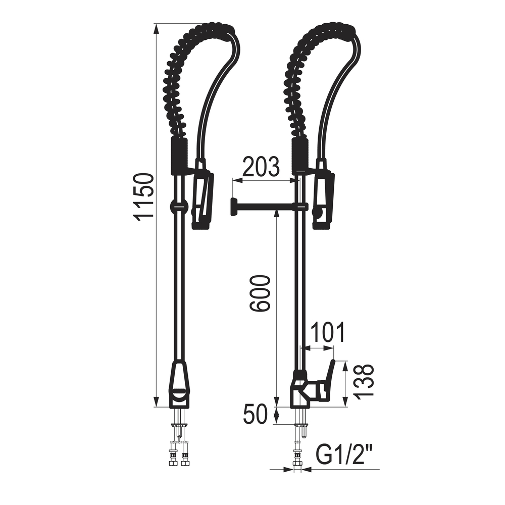 Grifo ducha industrial con regulación de chorro, mecanismo antichoque y cierre que evita los golpes de ariete. *Especialmente indicado para uso alimentario. *Cuerpos de latón y cromado de alta calidad y dureza. *Mando con montura cerámica. *Diseño bicolor negro y cromado. *Disponible con caño intermedio según modelo. *Brazo flexible de 1.000 mm con funda de PU para evitar nichos bacterianos y facilitar la limpieza. *Gancho de bloqueo para evitar MSD (trastornos musculoesqueléticos). *Caudal 12 l/min a 3 bar. *Cartucho sellado con discos cerámicos. *Presión de uso recomendada: 1 5 bar. *Entrada G1/2 hembra. *Accionamiento mediante maneta monomando. *El agua fluye hasta que el usuario lo detiene manualmente. *Temperatura admisible de agua: los materiales que componen las piezas de los grifos pueden soportar una temperatura máxima de 75ºC durante 30 mins máximo. *Suministrado con los elementos de fijación y conexión.