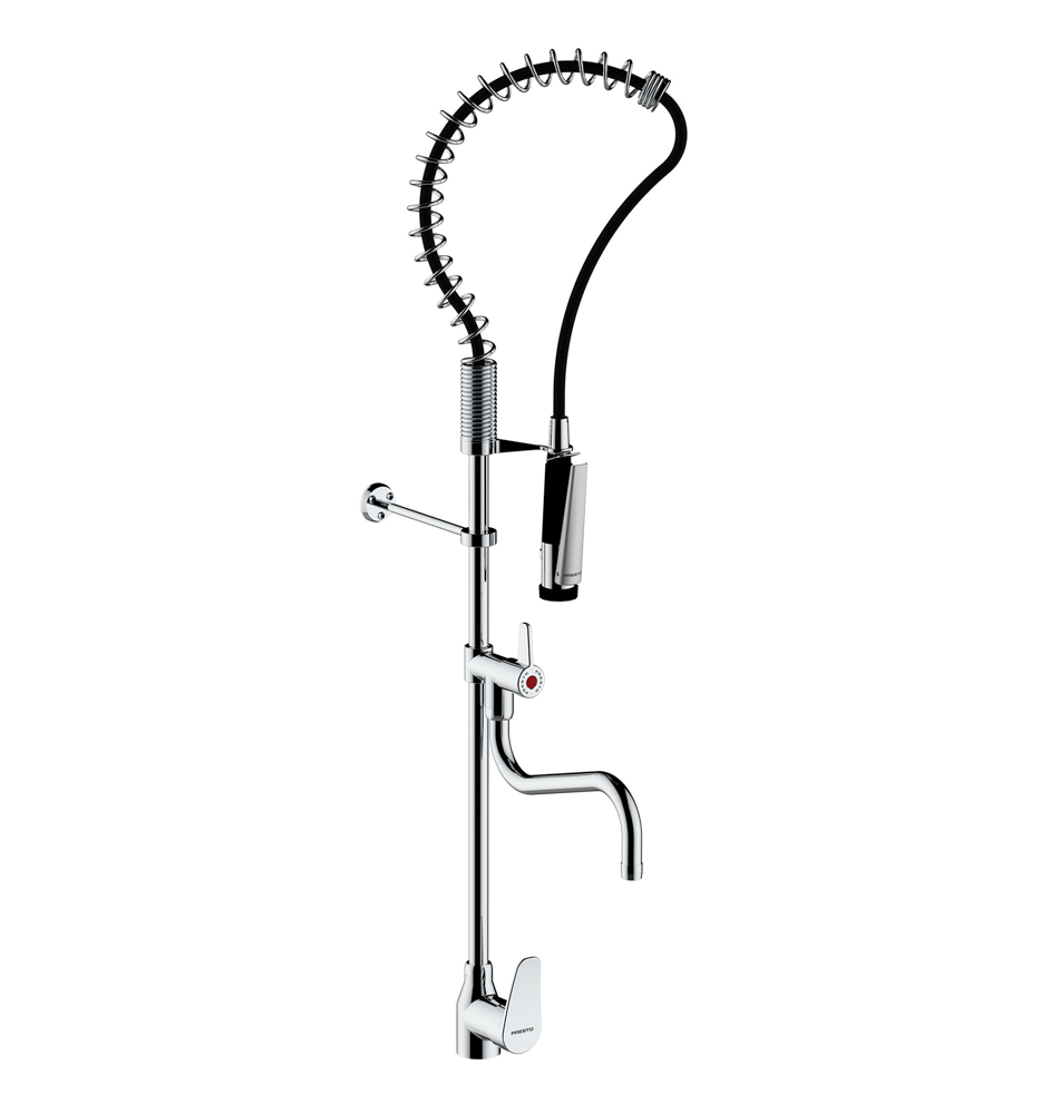 Grifo ducha industrial con regulación de chorro, mecanismo antichoque y cierre que evita los golpes de ariete. *Especialmente indicado para uso alimentario. *Cuerpos de latón y cromado de alta calidad y dureza. *Mando con montura cerámica. *Diseño bicolor negro y cromado. *Disponible con caño intermedio según modelo. *Brazo flexible de 1.000 mm con funda de PU para evitar nichos bacterianos y facilitar la limpieza. *Gancho de bloqueo para evitar MSD (trastornos musculoesqueléticos). *Caudal 12 l/min a 3 bar. *Cartucho sellado con discos cerámicos. *Presión de uso recomendada: 1 5 bar. *Entrada G1/2 hembra. *Accionamiento mediante maneta monomando. *El agua fluye hasta que el usuario lo detiene manualmente. *Temperatura admisible de agua: los materiales que componen las piezas de los grifos pueden soportar una temperatura máxima de 75ºC durante 30 mins máximo. *Suministrado con los elementos de fijación y conexión.