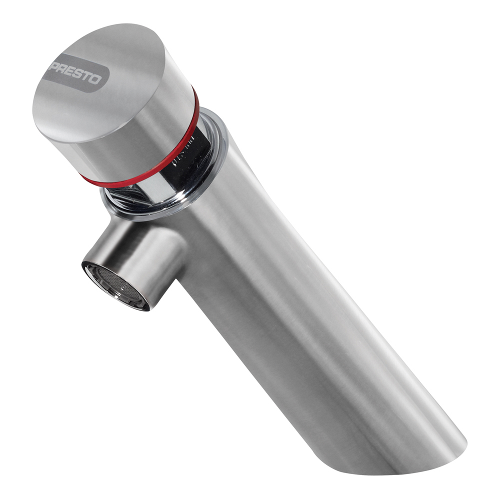 Cuerpo y pulsador en acero inoxidable, piezas interiores en materiales resistentes a la corrosión e incrustaciones calcáreas. *Cabeza intercambiable que comprende todo el mecanismo del grifo. *Presión de uso recomendada de 1 a 5 bars.